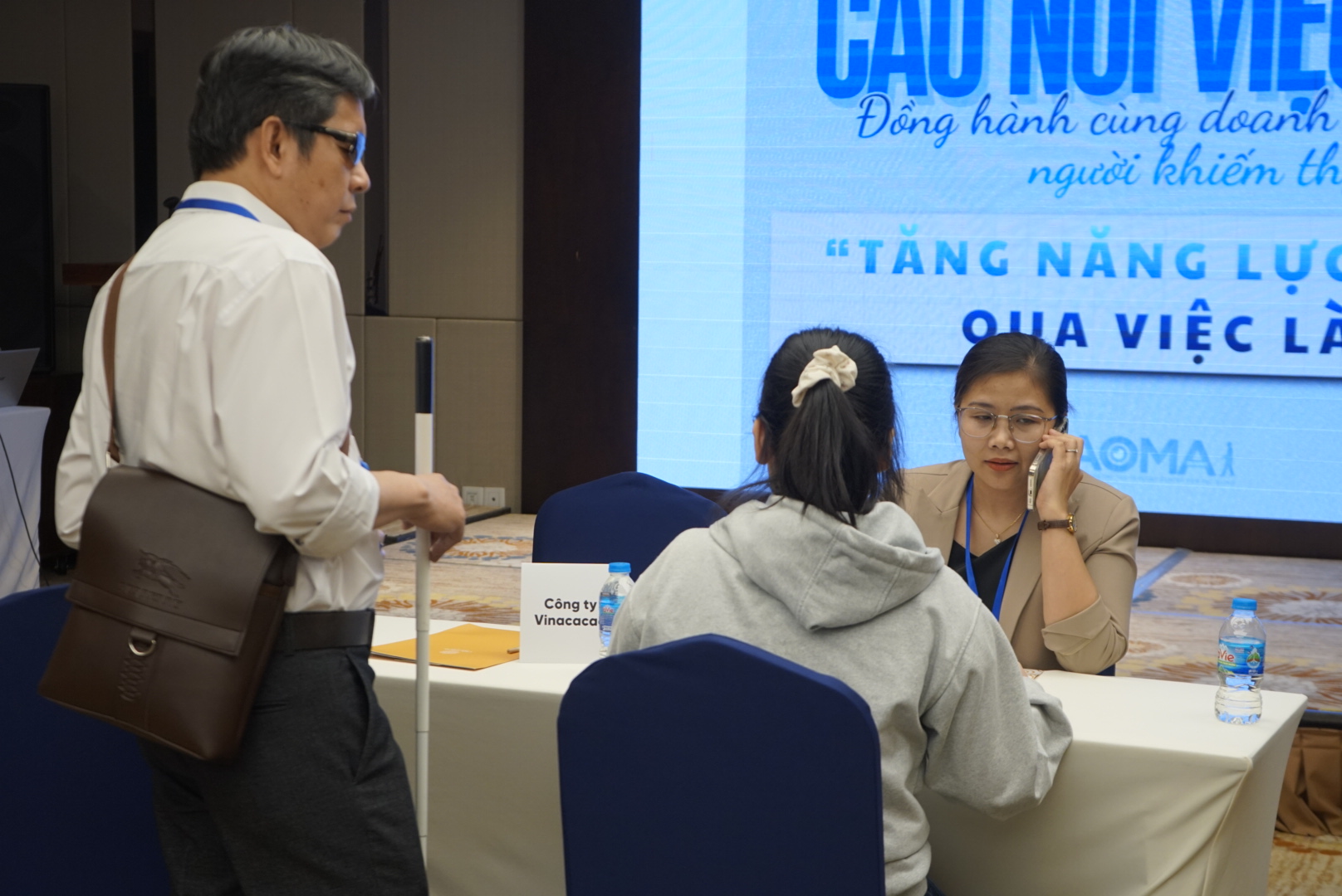 • 03 direct recruitment booths: Businesses introduced their organizations, staffing needs, and specific job vacancies, while also receiving applications and conducting initial interviews on site. People with visual impairments had the opportunity to speak directly with employer representatives, ask questions, present their experiences, and share their career aspirations.